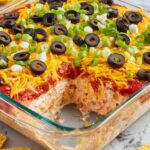 - Top with olives and onions: Scatter the sliced black olives and chopped green onions over the cheese layer.
