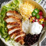 - Assemble the Burrito Bowls: In serving bowls, layer cooked rice and black beans as the base. Top with sliced chicken, shredded lettuce, sliced avocado, and a dollop of salsa. Serve immediately and enjoy.