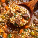 A hearty and comforting Beef Barley Soup made with tender beef chuck, aromatic vegetables, red wine, and pearl barley simmered to perfection for a flavorful and nourishing meal.