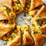 A delicious and visually stunning Crescent Breakfast Ring featuring scrambled eggs, crispy bacon, bell peppers, and melted cheddar cheese wrapped in flaky crescent rolls. Perfect for a hearty breakfast or brunch with family and friends.