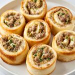 Sausage Pinwheels are a delicious and savory appetizer featuring a flavorful ground breakfast sausage and cream cheese filling, rolled inside crescent roll dough with cheddar cheese and green onions. Perfectly baked until golden brown, these pinwheels make a great snack or party treat.