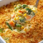 A hearty and comforting Vegetable Casserole loaded with creamy mushroom soup, a medley of vegetables, cheese, and rice, topped with a buttery cracker crust. Perfect as a main dish or side for any occasion.