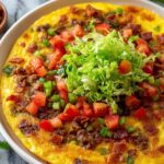 Cheeseburger Pie is a savory, comforting dish combining crispy bacon, seasoned ground beef, melted cheddar cheese, and a fluffy biscuit batter baked into a delicious pie. Topped with fresh lettuce, tomatoes, and pickles, this recipe makes a perfect hearty main course that brings classic cheeseburger flavors in a convenient pie form.