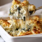 A creamy, cheesy spinach and artichoke pasta bake featuring rigatoni pasta combined with spinach, artichoke hearts, cream cheese, pecorino, and mozzarella, baked to golden perfection. This comforting dish is perfect for a satisfying dinner or family meal.