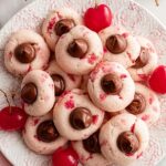 Cherry Blossom Cookies are delightful buttery treats infused with maraschino cherry juice and almond extract, studded with chopped maraschino cherries, and topped with iconic Hershey’s Kisses. These soft, melt-in-your-mouth cookies offer a beautiful pink hue and a perfect balance of sweetness and subtle almond flavor, making them an ideal dessert or snack for any occasion.