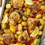 - Combine and Roast: Transfer seared chicken, browned sausage, and sauce mixture onto the baking sheet with the roasted potatoes. Spread everything evenly to cook uniformly. Return the baking sheet to the oven and roast for another 25 minutes, or until the chicken reaches an internal temperature of 165°F and the sauce thickens slightly.