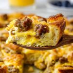 A hearty and comforting Christmas Breakfast Casserole featuring savory sausage, eggs, cheese, and bread, perfect for holiday mornings or weekend brunch.