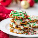 - Melt and Drizzle White Candy Melts with Sprinkles: Repeat the melting process for the white candy melts and drizzle them over the pretzels. Immediately sprinkle holiday sprinkles over the wet candy melts before they set.