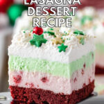 A festive Christmas Lasagna Dessert featuring a red velvet cake base, creamy peppermint cream cheese layer, and green vanilla pudding topped with whipped topping and holiday sprinkles. Perfect for holiday gatherings and easy to prepare ahead.