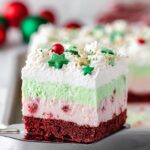 A festive Christmas Lasagna Dessert featuring a red velvet cake base, creamy peppermint cream cheese layer, and green vanilla pudding topped with whipped topping and holiday sprinkles. Perfect for holiday gatherings and easy to prepare ahead.