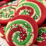 These festive Christmas Pinwheel Cookies feature vibrant red, green, and white swirled dough layered with holiday sprinkles. The buttery, tender cookies are chilled, sliced, and baked to a delicate golden perfection, making them a perfect sweet treat for the holiday season.