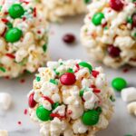 Delightfully festive Christmas Popcorn Balls made with melted marshmallows, buttery popcorn, colorful M&M candies, and sprinkles. These sweet, handheld treats are perfect for holiday parties and gift-giving, combining crunchy popcorn with gooey marshmallow and a pop of holiday colors.
