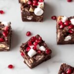This festive Christmas Rocky Road is a delightful holiday dessert combining rich semi-sweet chocolate, creamy almond butter, crunchy roasted almonds, tart dried cranberries, and fluffy mini marshmallows, all enhanced with warm holiday spices and topped with vibrant pomegranate seeds. Perfect as a sweet treat or gift during the holiday season.