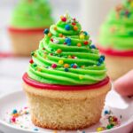 Festive Christmas Tree Cupcakes featuring moist vanilla cake topped with green buttercream frosting piped to resemble a Christmas tree, decorated with colorful sprinkles and Twizzler candy for a fun holiday treat.