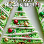 Festive Christmas Tree Rice Krispie Treats made with melted marshmallows, vanilla, green food coloring, and crispy rice cereal, decorated with white chocolate, sprinkles, and pretzel stick trunks for a fun holiday snack or dessert.