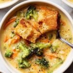 A creamy and comforting Broccoli Cheddar Soup made with tender broccoli, shredded cheddar cheese, and a rich blend of milk and vegetable broth. Perfect for a cozy meal, this soup combines fresh vegetables with a cheesy, smooth base, garnished optionally with homemade croutons.