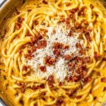 - Toss pasta with sauce and serve: Return the drained pasta to the skillet with the sauce and toss well until fully coated. Serve topped with crispy pancetta and a generous sprinkle of grated parmesan cheese. Garnish with chopped Italian parsley if desired.
