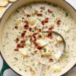 A rich and creamy New England-style clam chowder featuring smoky bacon, tender potatoes, and succulent clams simmered in a flavorful broth with a perfect balance of herbs and spices.