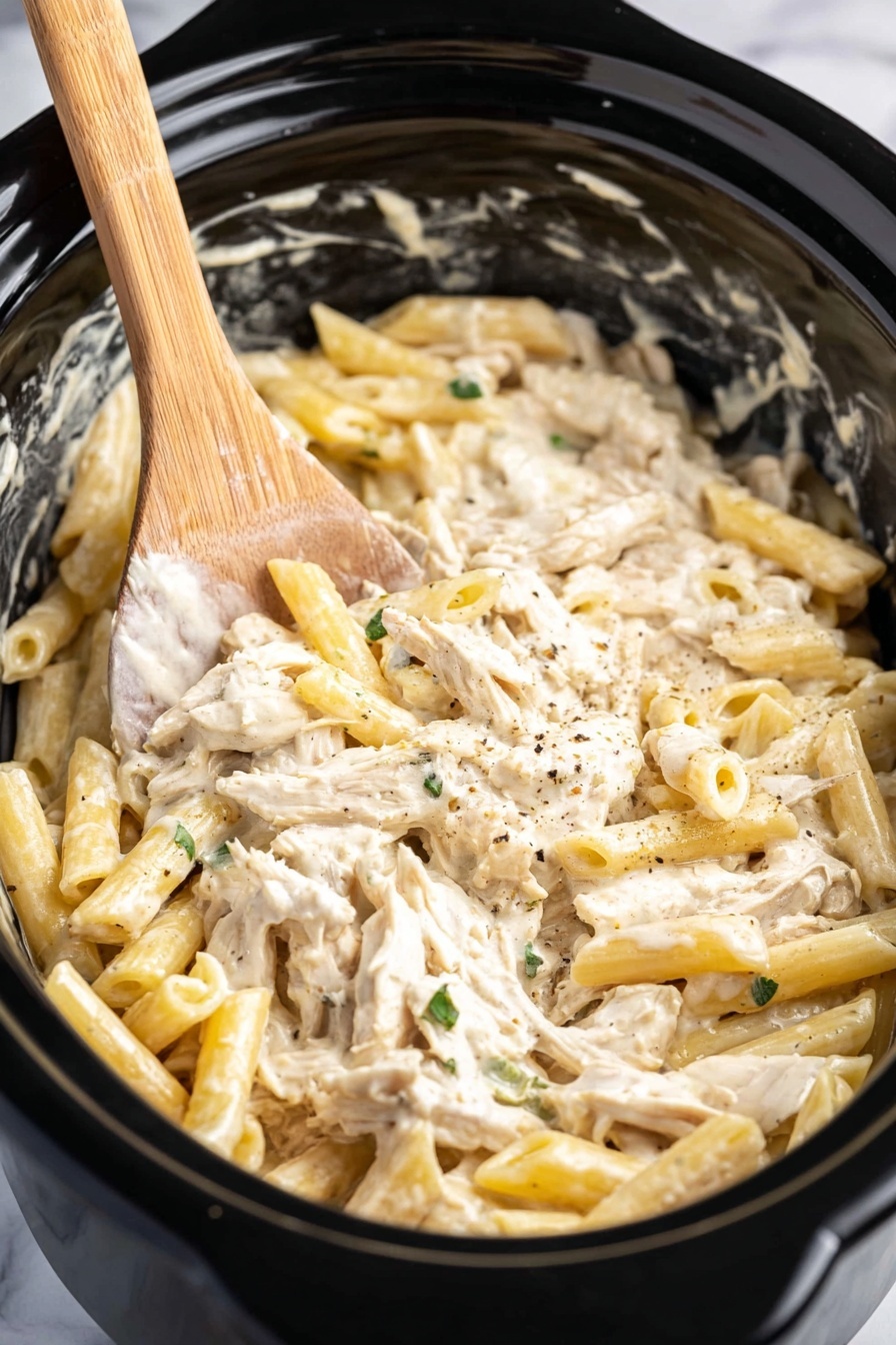 Set your crockpot to low and let it cook for 5 hours. If you’re short on time, the high setting will work too—just for 2½ hours. You’ll know the chicken is ready when it’s tender, juicy, and the sauce smells irresistible. This slow cooking melds all those flavors into a rich, creamy base ready for the pasta.