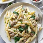This creamy sausage pasta combines savory Italian sausage with a luscious garlic Parmesan cream sauce, tender penne pasta, and fresh baby spinach for a comforting, flavorful meal ready in just 20 minutes.