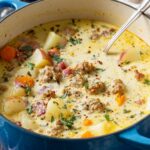 Sausage Potato Soup is a comforting and hearty soup featuring spicy Italian sausage, tender red potatoes, diced vegetables, and a rich creamy broth. Enhanced with flavorful seasonings like basil, parsley, oregano, mustard powder, and a touch of hot sauce, this soup is perfect for cozy meals. The optional addition of cheddar cheese adds a delicious savory finish.