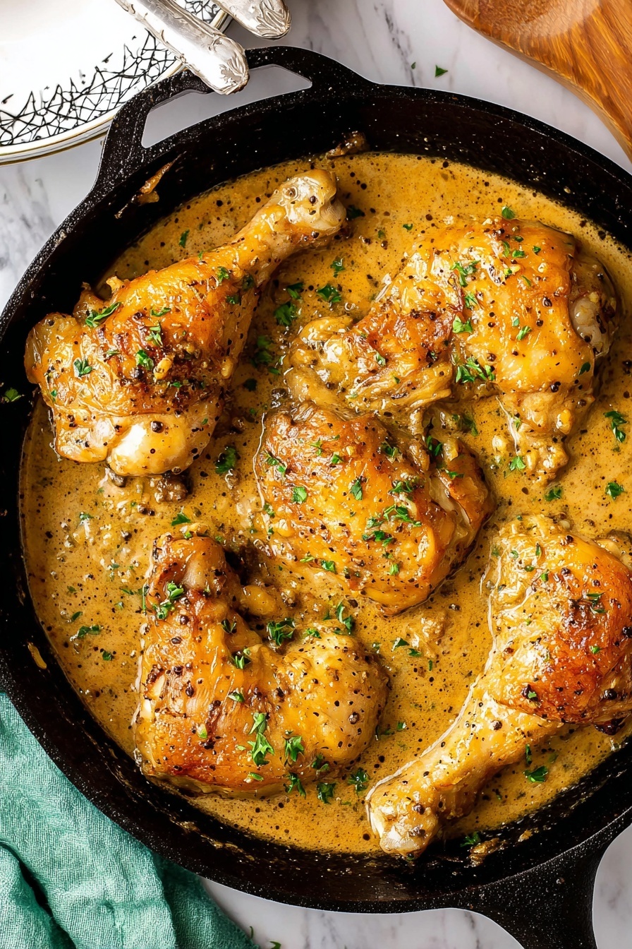 Savory Southern smothered chicken featuring tender fried chicken thighs and drumsticks cooked in a rich, creamy onion gravy. This classic comfort food is perfectly seasoned and ideal for warming up on cold days.
