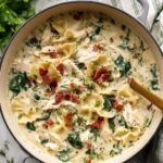 A comforting and creamy White Lasagna Soup featuring tender shredded chicken, sun-dried tomatoes, spinach, and a blend of Italian seasonings, finished with a trio of cheeses for a delicious twist on traditional lasagna.