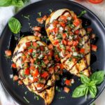 This Easy Bruschetta Chicken recipe features tender grilled chicken breasts seasoned with Italian spices and garlic, topped with a fresh, vibrant tomato and basil bruschetta mixture. Finished with melted mozzarella and a drizzle of balsamic glaze, it makes a delicious and impressive main course perfect for any dinner.