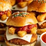 These Chicken Parmesan Sliders are a delicious and satisfying twist on classic chicken parmesan, served on soft slider buns. Tender chicken breasts are marinated in buttermilk, breaded with a seasoned mixture, fried to golden perfection, and layered with marinara sauce, provolone, and gooey mozzarella sticks. Finished with a fragrant butter topping on toasted slider buns, these sliders are perfect for parties, game days, or a fun family meal.