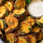 Crispy fried zucchini crisps coated in a seasoned flour and panko breading, served with a creamy homemade garlic aioli dipping sauce. Perfect as an appetizer or snack, these zucchini crisps are golden, crunchy, and packed with flavor.