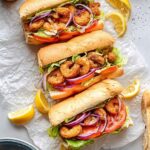 This classic Louisiana shrimp po' boy recipe features crispy, golden fried shrimp nestled in light and pillowy French bread, dressed with tangy remoulade sauce, pickles, lettuce, tomato, and onion for an iconic and flavorful American sandwich experience.