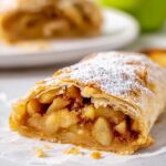 This traditional German Apple Strudel (Apfelstrudel) recipe features a flaky, delicate strudel dough filled with thinly sliced apples, golden raisins, cinnamon, and a buttery breadcrumb layer. The dough is stretched paper-thin for a perfect texture and baked until golden brown, then dusted with powdered sugar for a classic dessert with a comforting aroma of cinnamon and baked apples.