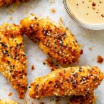 These Everything Bagel Chicken Tenders are classic baked chicken tenders elevated with a flavorful and crunchy coating made from garlic, onions, sesame seeds, and poppy seeds found in everything bagel seasoning. Perfectly baked to a golden crisp and served with your favorite dipping sauces, they make a delicious and easy meal for any day.
