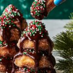 This festive Christmas Tree Churros recipe features crispy, golden churro rings stacked to form a delightful holiday tree, topped with rich chocolate ganache and colorful sprinkles. Perfect for a fun and impressive dessert during the holiday season.