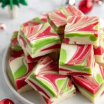 This Christmas Fudge is a festive, colorful treat featuring creamy white chocolate combined with sweetened condensed milk and swirled with vibrant red and green gel food coloring. Perfect for holiday gatherings, this fudge is rich, smooth, and visually appealing with its decorative swirls.