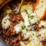 This French Onion Pot Roast recipe features a tender, slow-braised chuck roast cooked with caramelized yellow onions, garlic, white wine, and aromatic herbs. Topped with melted Gruyere cheese and served with toasted baguette slices, it offers a rich and comforting meal perfect for cozy dinners.