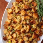 This stuffing pairs beautifully with roast turkey, mashed potatoes with gravy, and cranberry sauce. I also love serving it alongside green bean casserole and glazed carrots to round out the plate with a variety of textures and flavors.
