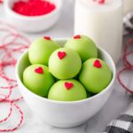 Delight in the festive spirit with these Grinch Christmas Truffles, made from crushed Oreos and creamy whipped cream cheese, coated in vibrant green vanilla almond bark and topped with red heart sprinkles. Perfect for holiday parties or gifting, these no-bake treats are easy to prepare and irresistibly delicious.
