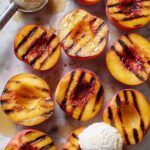 Grilled Peaches with Vanilla Ice Cream is a quick and delicious dessert featuring juicy, caramelized peaches and nectarines paired with creamy vanilla ice cream, finished with a drizzle of honey and a sprinkle of sea salt for a perfect balance of sweet and savory flavors.