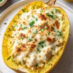 A healthy and delicious Skinny Chicken Alfredo Stuffed Spaghetti Squash recipe that combines tender roasted spaghetti squash with a creamy, light Alfredo sauce made with reduced-fat milk and shredded rotisserie chicken, topped with melted mozzarella cheese and fresh parsley for a satisfying low-calorie meal.