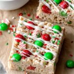 These Holiday Rice Krispie Treats are a festive twist on a classic snack, combining gooey marshmallows, crispy cereal, colorful holiday M&M's, and sprinkles, all drizzled with creamy white chocolate for an extra special touch. Perfect for holiday gatherings and easy to make with simple ingredients.