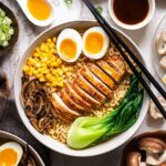 A comforting homemade chicken ramen recipe featuring tender chicken thighs, fresh baby bok choy, shiitake mushrooms, and a flavorful broth enhanced with dashi powder or miso paste. Served with perfectly cooked ramen noodles and topped with sesame oil, toasted sesame seeds, corn, and green onions for a delicious and authentic taste.