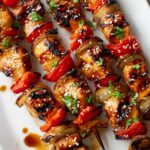 Honey Garlic Chicken Skewers are tender pieces of chicken marinated in a sweet and savory honey garlic sauce, then grilled on skewers with fresh vegetables and sprinkled with sesame seeds and coriander. Perfect for BBQs or a flavorful dinner served alongside rice or potatoes.