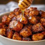 Hot Honey Salmon Bites are flavorful, bite-sized pieces of salmon seasoned with paprika, garlic, and onion powder, air-fried to perfection, and coated in a luscious sweet and spicy hot honey butter glaze. Perfect as an appetizer or main course served alongside your favorite side.