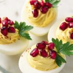 - Garnish and serve: Top each deviled egg with a small parsley stem and 2-3 pomegranate seeds for a festive touch. Serve immediately or refrigerate until ready to serve.