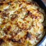 This comforting Irish scalloped potatoes dish features layers of thinly sliced russet potatoes baked with tender caramelized cabbage, sweet leeks, creamy heavy cream, and sharp Irish cheddar cheese. Finished with fresh herbs and cracked black pepper, this hearty casserole combines classic Irish flavors in a creamy, cheesy bake perfect for a delicious side or main dish.