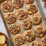 Kitchen Sink Cookies are a delightful medley of sweet and salty flavors packed into thick, chewy cookies. Loaded with chocolate chips, toffee bits, chopped pretzels, crushed potato chips, and festive holiday jimmies, these cookies offer an irresistible combination of textures and tastes perfect for any festive occasion or indulgent treat.