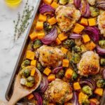 A flavorful and easy sheet pan meal featuring tender boneless chicken thighs glazed with a sweet and savory maple sauce, roasted alongside hearty butternut squash, brussels sprouts, and red onion for a comforting and nutritious dinner.