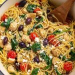 This Mediterranean Pasta recipe is a flavorful one-pot meal featuring tender lemon pepper chicken, angel hair pasta, spinach, cherry tomatoes, kalamata olives, and creamy feta cheese. Cooked in a rich garlic butter sauce with a splash of white wine and Greek dressing, it's a vibrant and easy dish perfect for a quick and satisfying dinner.