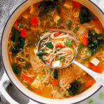 - Add Noodles and Vegetables: Add the thin rice noodles and chopped red bell pepper to the pot. Simmer for 2 minutes, then turn off the heat.